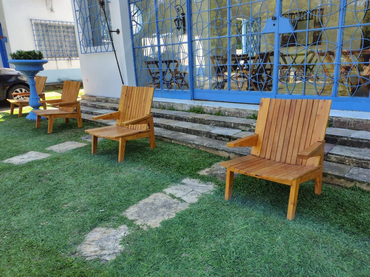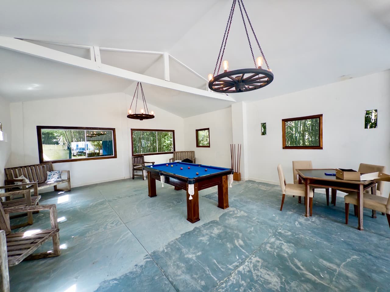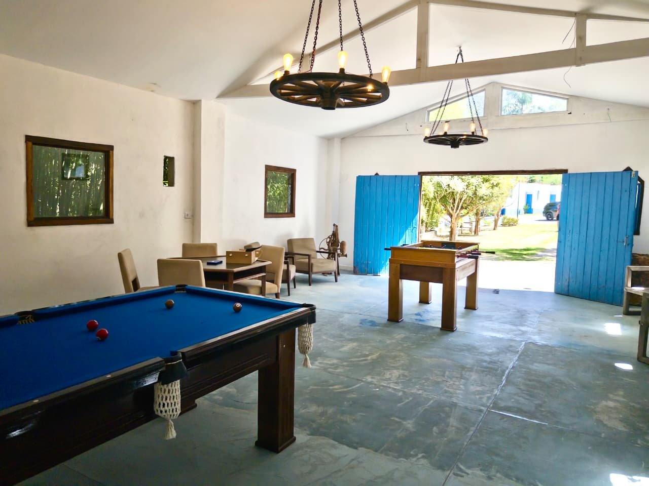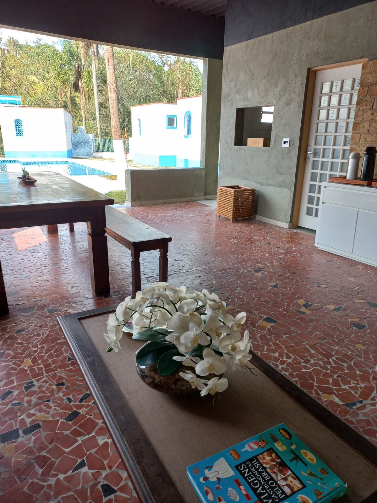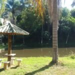 Espaço preparado para receber grupos e celebrações em um ambiente acolhedor cercado pela natureza.
